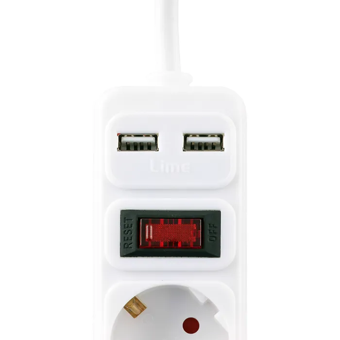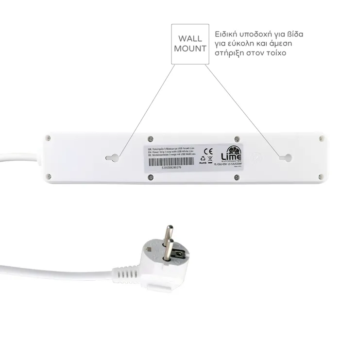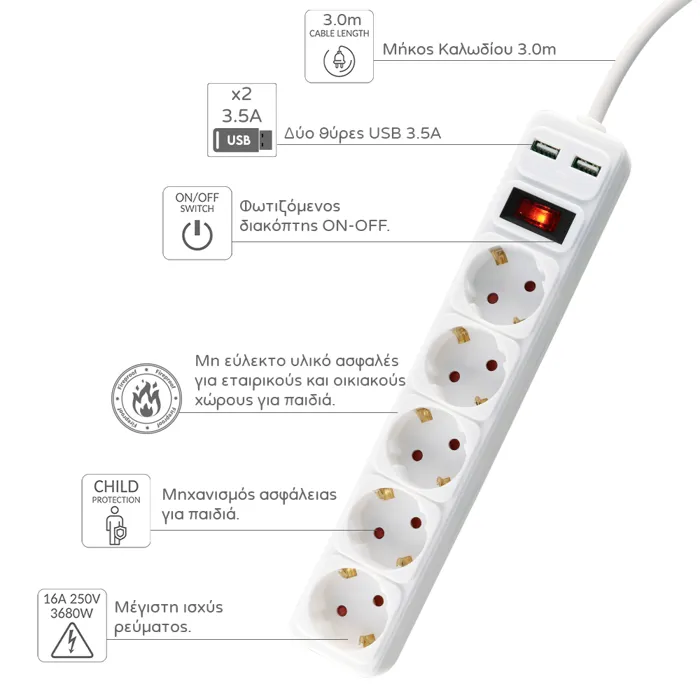 Πολύπριζο 5 θέσεων με προστασία: 16Α, 3680W, 2x USB-A (3.5A), υπερφόρτωσης, υπέρτασης, παιδική προστασία, θερμική ασφάλεια, IP20, διακόπτης ασφαλείας, καλώδιο 3m, στήριξη τοίχου, μη εύφλεκτο υλικό, πιστοποιήσεις CE VDE 0620-1:2016, LVD 2014/35/EU.